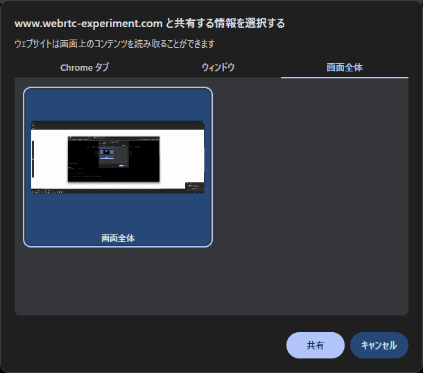 画面共有をする際に HTML5 の getDisplayMedia という機能で実装されていることが多いです。具体的には、こんな感じで、